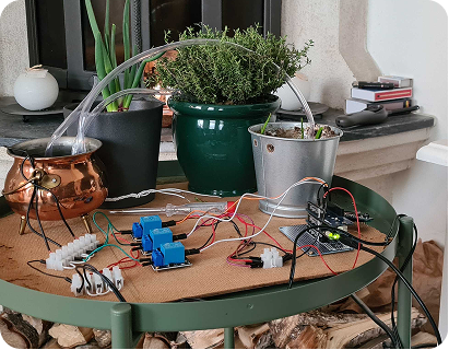 Automates plant care using soil moisture sensors.