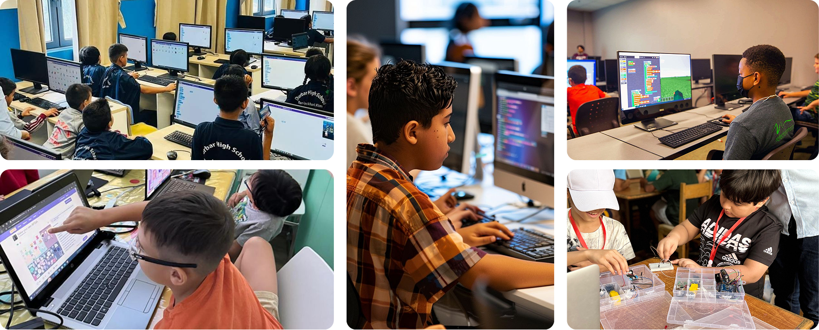 Watch students collaborating in virtual builds, learning coding through gameplay, and solving creative design challenges.