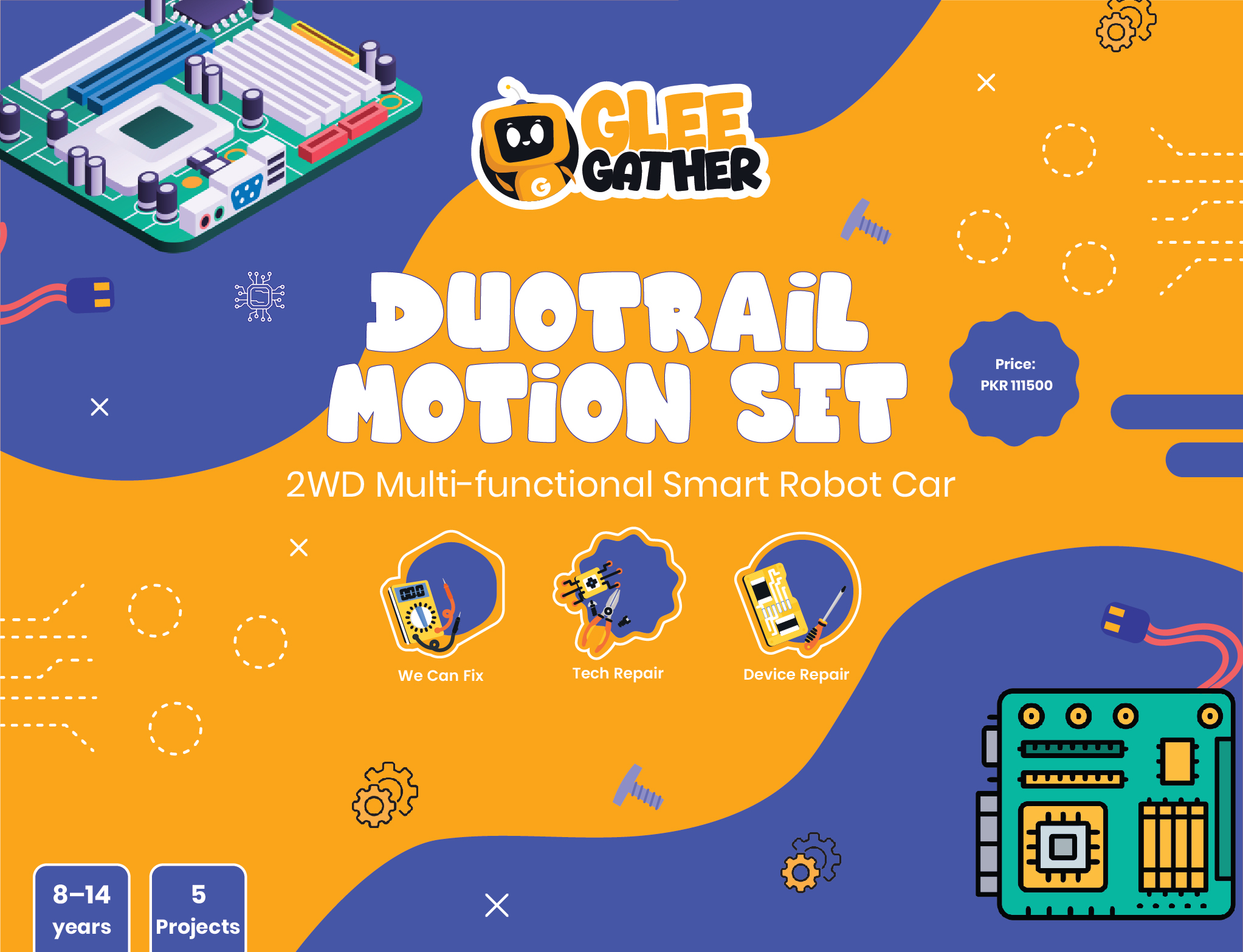2WD multifunctional smart robot car for ages 8–14. Arduino-powered with motors, sensors, RGB LEDs, and battery pack. Projects include line following, obstacle avoidance, light tracking, app-controlled cars, and maze solvers.