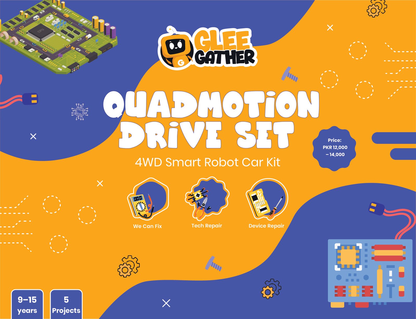 4WD smart robot car kit for ages 9–15. Arduino-based with motors, sensors, RGB LEDs, and Bluetooth/Wi-Fi. Build line followers, obstacle avoiders, light-seeking cars, remote-controlled and maze-solving robots.
